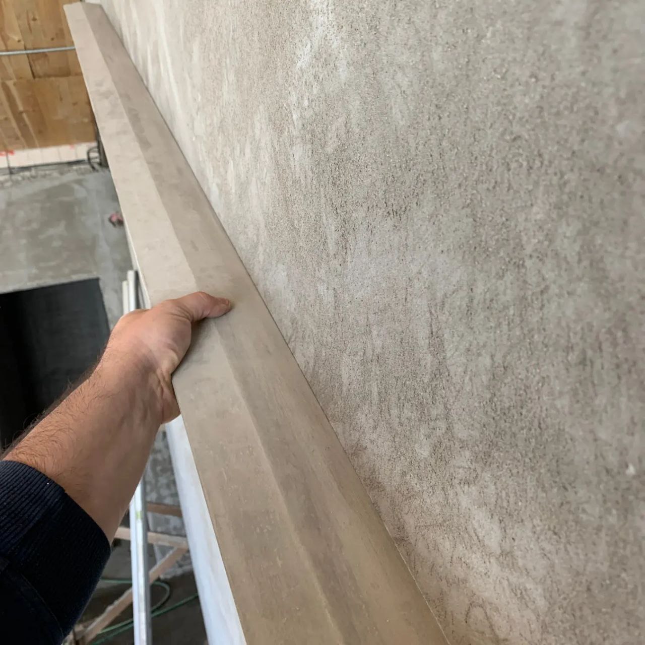 После окончания выравнивания раствора и его высыхания, удаляются штукатурные маяки и выполняется подрезание с помощью трапециевидного правила. После чего стены затираются до получения идеальной поверхности под финишную отделку.